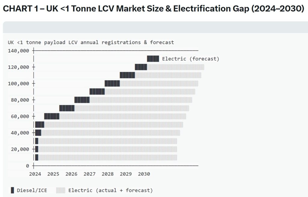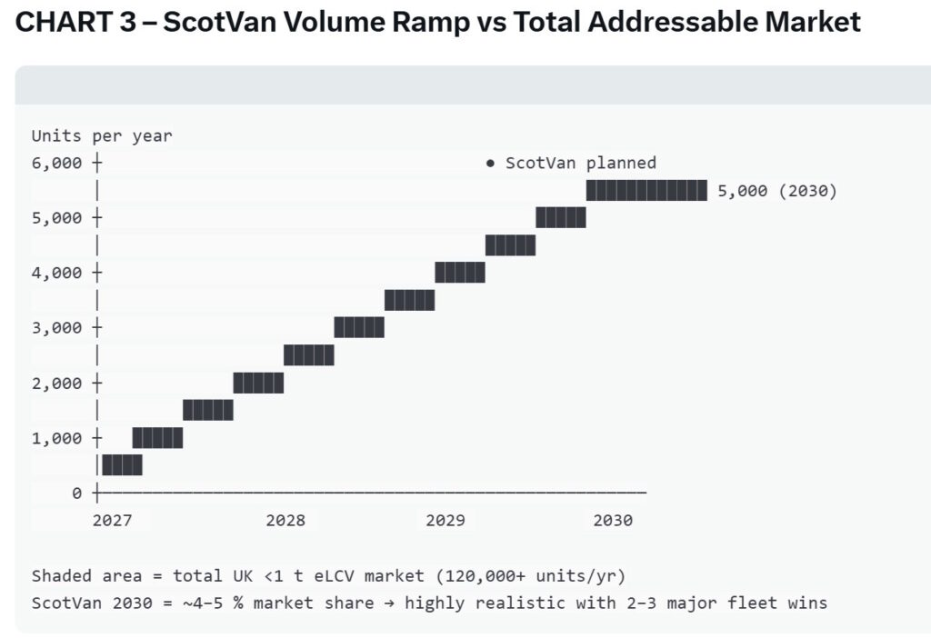 • Only ~5,000 <1t electric vans were sold in 2024 → by 2030 the market will need 80,000–100,000 electric units per year to meet net-zero fleet targets. ScotVan targets 5 % of this volume from 2028. See Chart 1 below.
