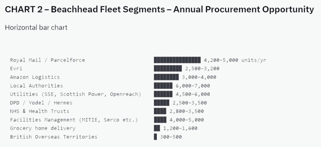 • Chart 2 below summarises the TAM: Parcel & courier fleets alone need >15,000 new eLCVs every year – ScotVan’s sweet spot.